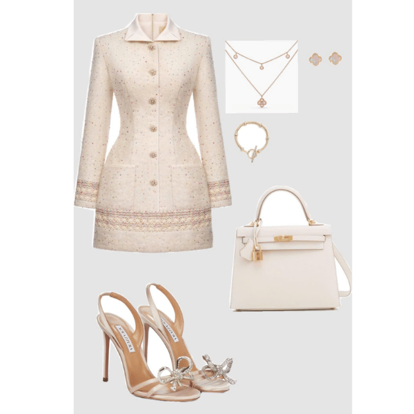 Tweed không chỉ dành cho mùa thu đông. Khi may set váy hoặc đầm tweed dáng suông, bạn sẽ có một outfit thanh lịch, phù hợp các bữa tiệc cocktail hoặc event ban ngày.