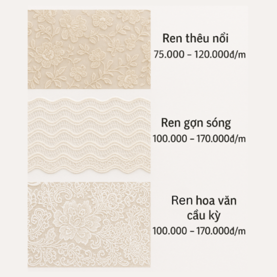 - Ren gợn sóng, ren hoa văn cầu kỳ: 100.000 – 170.000đ/m