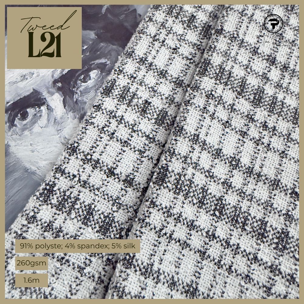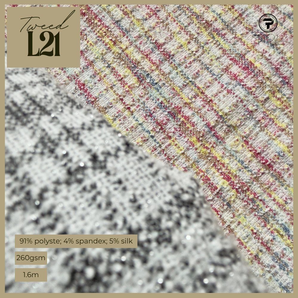 Tweed L21 mang hơi thở giao thoa giữa cổ điển và hiện đại. Gam ngũ sắc đan xen tinh tế, tạo nên hiệu ứng thị giác sống động, cho bề mặt vải thêm chiều sâu và sang trọng.